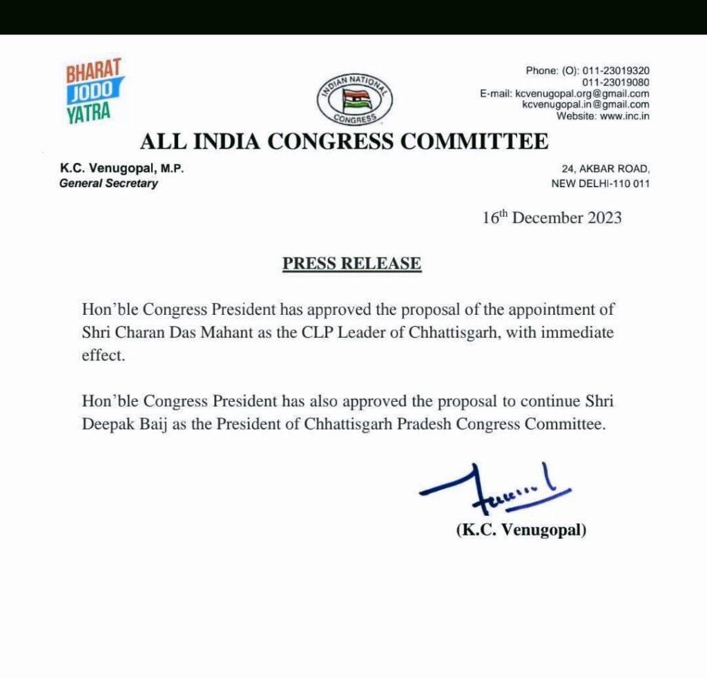 रायपुर. कांग्रेस ने चरणदास महंत को नेता प्रतिपक्ष बनाया है. नेता-प्रतिपक्ष के लिए भी विधायकों से रायशुमारी की गई थी. विधायक दल की बैठक में नेता प्रतिपक्ष के लिए डॉ. चरणदास महंत के नाम पर सभी ने एक स्वर में सहमति जताई गई थी. जिनकी नियुक्ति राष्ट्रीय अध्यक्ष मल्लिकार्जुन खड़गे ने की है. जानकारी के अनुसार, दीपक बैज पीसीसी अध्यक्ष के रूप में काम करते रहेंगे.