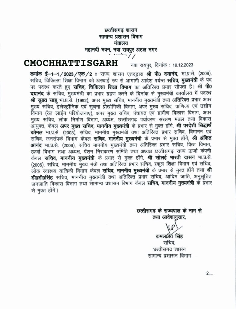 रायपुर राज्य शासन ने भारतीय प्रशासनिक सेवा के अधिकारियों के नवीन पदस्थापना आदेश जारी किया है। देखें सूची