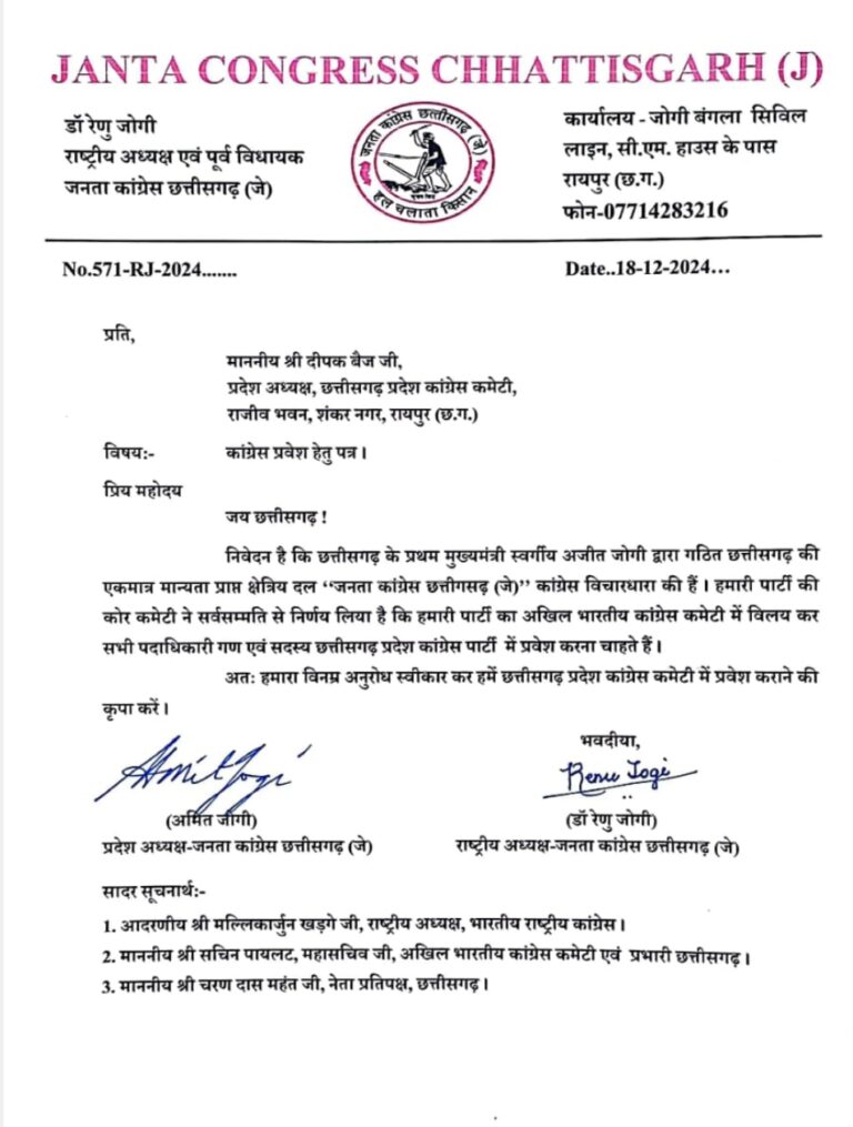 जनता कांग्रेस की मुखिया डॉ रेणु जोगी ने जनता कांग्रेस को कांग्रेस में विलय की पेशकश की है। उन्होंने पार्टी के राष्ट्रीय अध्यक्ष मल्लिकार्जुन खड़गे, और प्रदेश कांग्रेस संगठन के पदाधिकारियों को पत्र लिखा है।