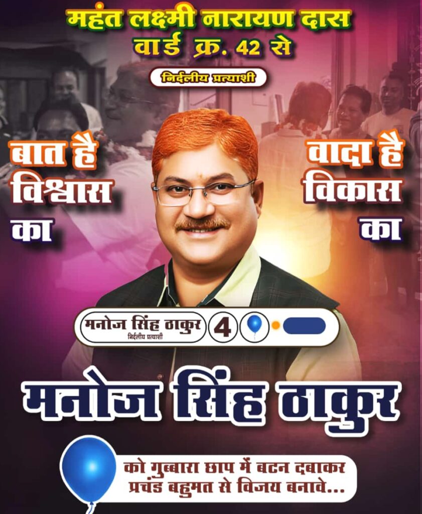 इस बीच, गुब्बारा छाप से निर्दलीय प्रत्याशी मनोज सिंह ठाकुर का जनसंपर्क अभियान भी जोरों शोरों से चल रहा है। चुनावी दौरे के दौरान उन्हें वार्डवासियों का भरपूर समर्थन मिल रहा है। आज प्रत्याशी मनोज ठाकुर को जनसंपर्क के दौरान महिलाओं बच्चों और बुजुर्गों समेत हर वर्ग के लोगों का साथ मिला।
