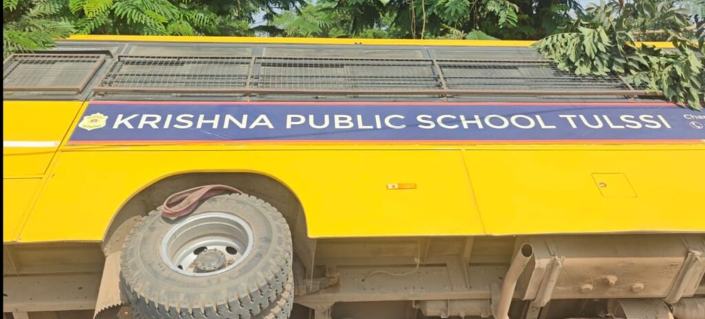 रायपुरकृष्णा पब्लिक स्कूल की बस पलटी स्कूली बच्चों को लेने जा रही थी बस