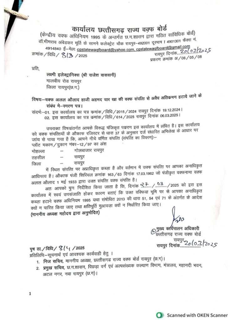 बता दें कि रायपुर में फर्जी तरीके से रजिस्ट्री की गई संपत्तियों में लक्ष्मी इलेक्ट्रिकल्स, ए-टू-जेड बेकरी, पगारिया ज्वेलर्स समेत 14 से अधिक प्रतिष्ठानों के नाम सामने आए हैं। वक्फ बोर्ड ने 400 से अधिक लोगों को नोटिस जारी किए हैं।